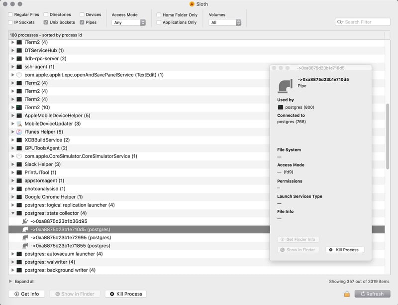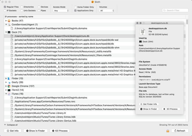 Sloth is a native macOS app that shows all open files, directories, sockets, pipes, and devices currently in use by running processes. A polished GUI wrapper for lsof, invaluable for debugging, security auditing, and understanding what your apps are actually doing.